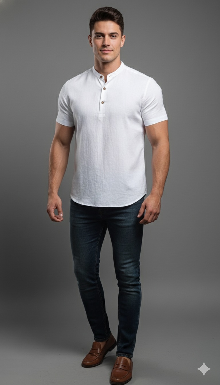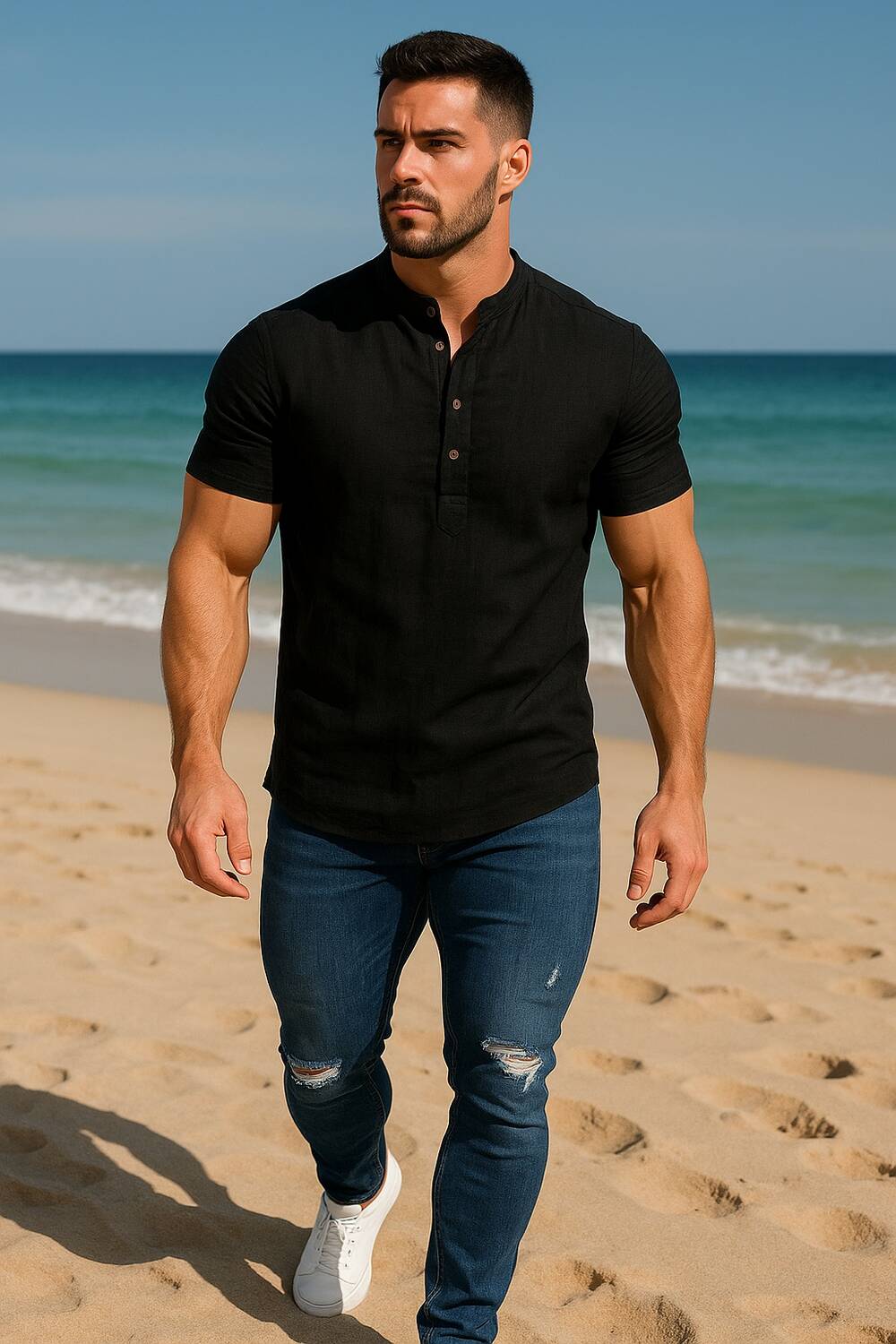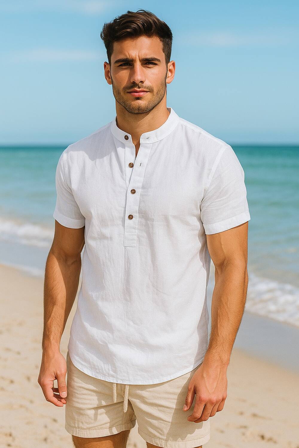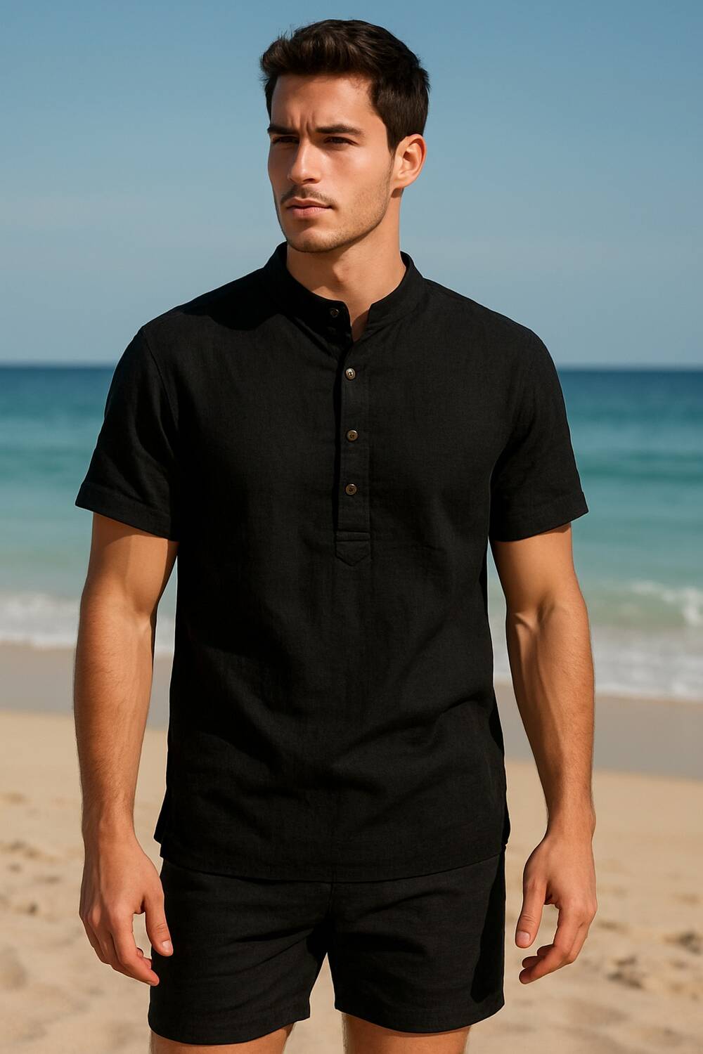 CAMISOLA HOMBRE LINO CUELLO MAO MANGA CORTA